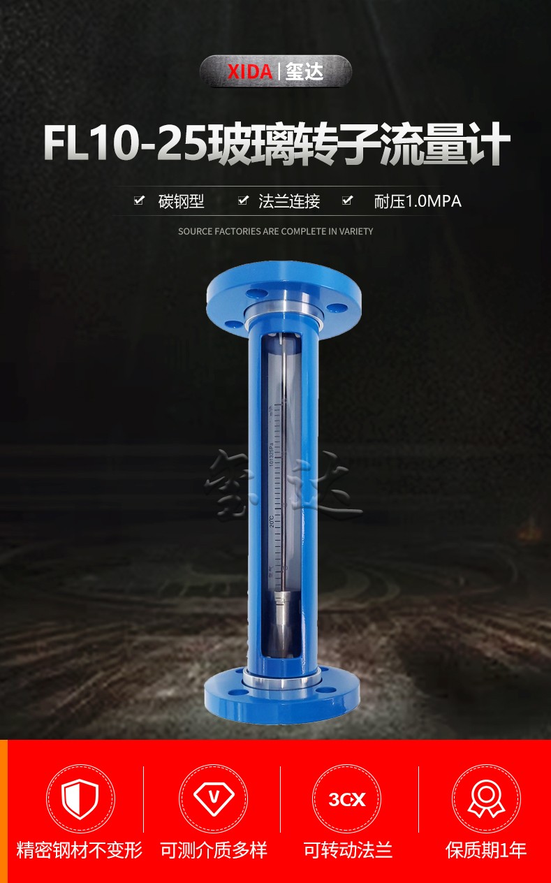 FL10-25法蘭玻璃轉子流量計是一款碳鋼材質,市場通用,垂直安裝,可測量氣體or液體的瞬間流量計。