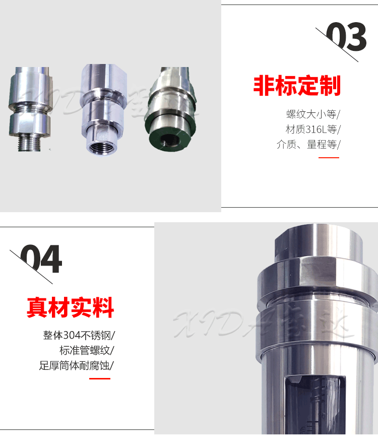 3. 外形:璽達(dá)儀表采用整體304不銹鋼,標(biāo)準(zhǔn)螺紋,適用水,氣等設(shè)備,真材實(shí)料,足厚足料。