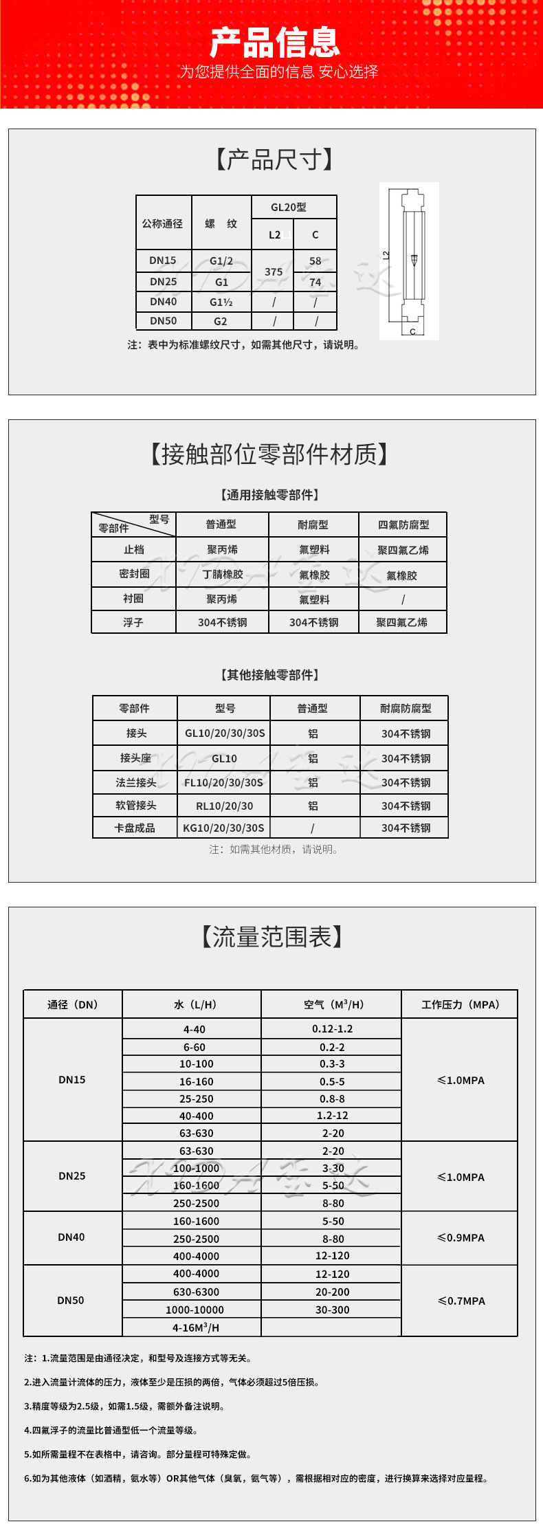 2.性能:GL20-25F玻璃轉(zhuǎn)子流量計(jì)采用G1管螺紋,工作壓力可達(dá)1.0MPa,螺紋連接,接液部位不銹鋼。